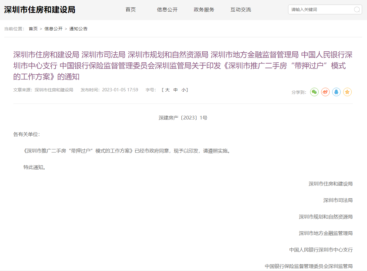 1月5日,深圳市住房和建设局等六部门联合发布关于印发《深圳市推广二手房“带押过户”模式的工作方案》的通知。深圳市推广二手房“带押过户”模式的工作方案为探索推广二手...