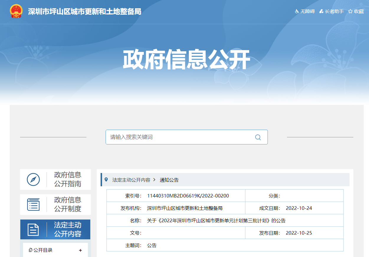 10月25日,深圳市坪山区城市更新和土地整备局发布关于《2022年深圳市坪山区城市更新单元计划第三批计划》的公告,该批次包含天俊工业园城市更新单元、新和村片区城市更新单...