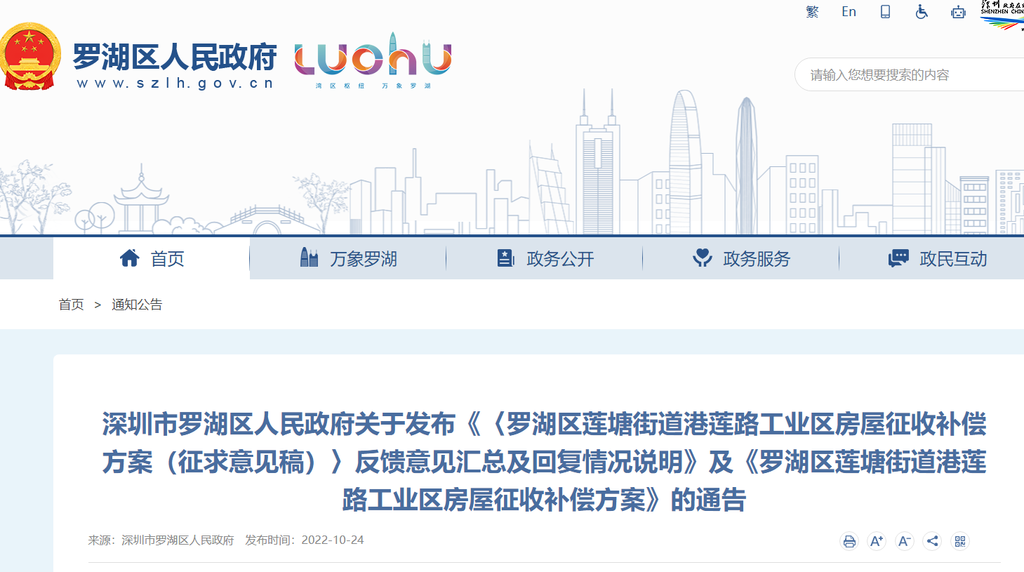 10月24日,深圳市罗湖区人民政府发布《〈罗湖区莲塘街道港莲路工业区房屋征收补偿方案(征求意见稿)〉反馈意见汇总及回复情况说明》及《罗湖区莲塘街道港莲路工业区房屋征...