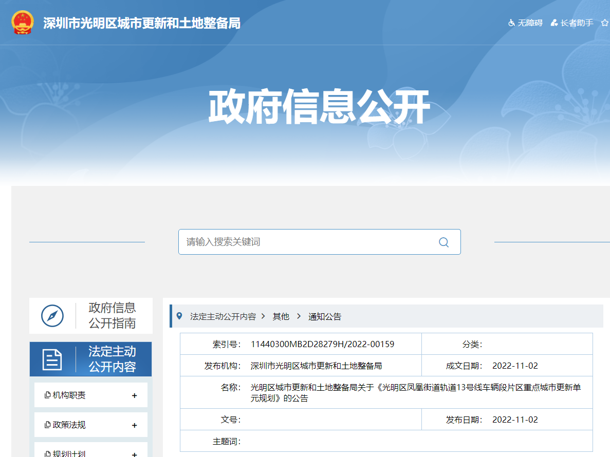 11月2日,光明区城市更新和土地整备局发布关于发布《光明区凤凰街道轨道13号线车辆段片区重点城市更新单元规划》的公告。项目历程2020年5月,光明区城市更新和土地整备局发...