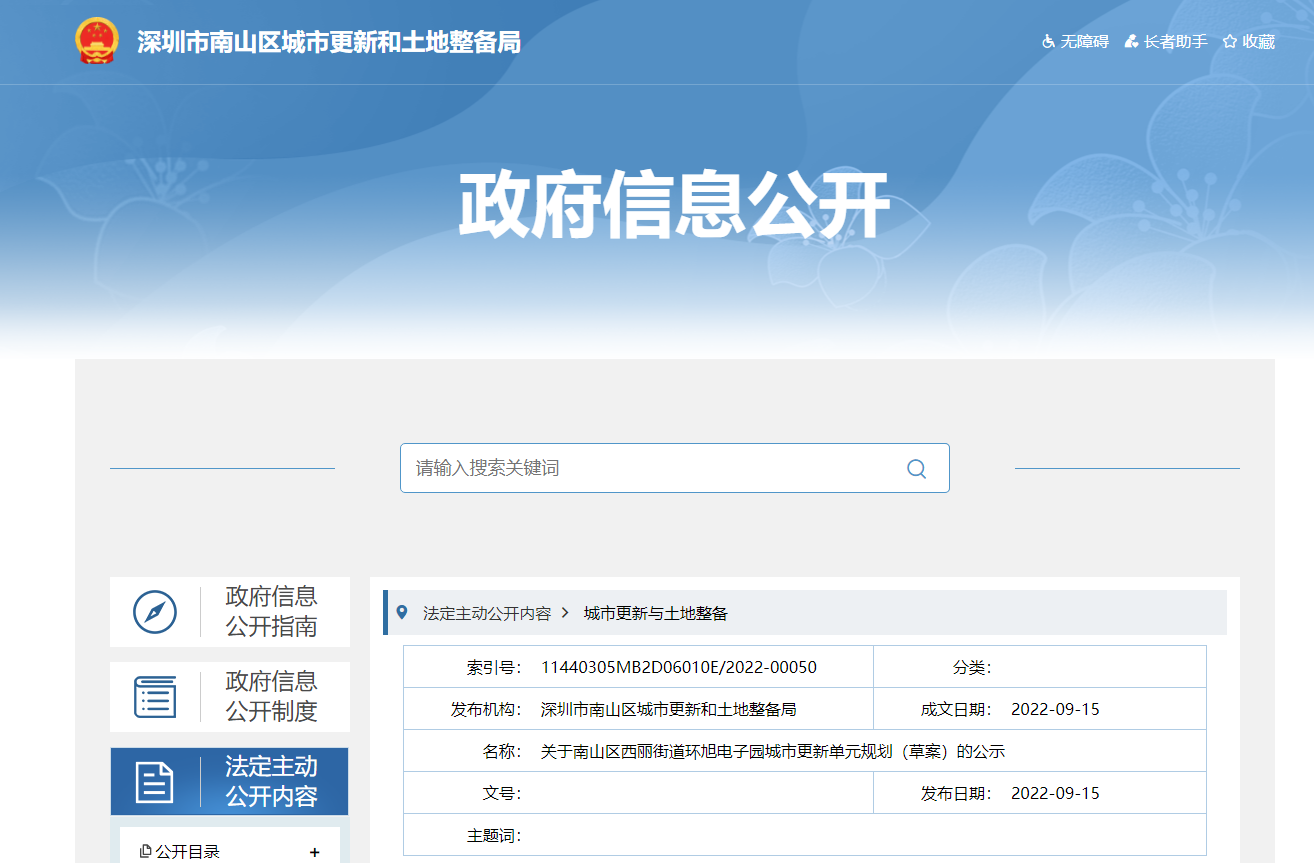 9月15日,深圳市南山区城市更新和土地整备局发布《关于南山区西丽街道环旭电子园城市更新单元规划(草案)的公示》的公告。项目位于南山区西丽街道高新区北区北环大道与高新...