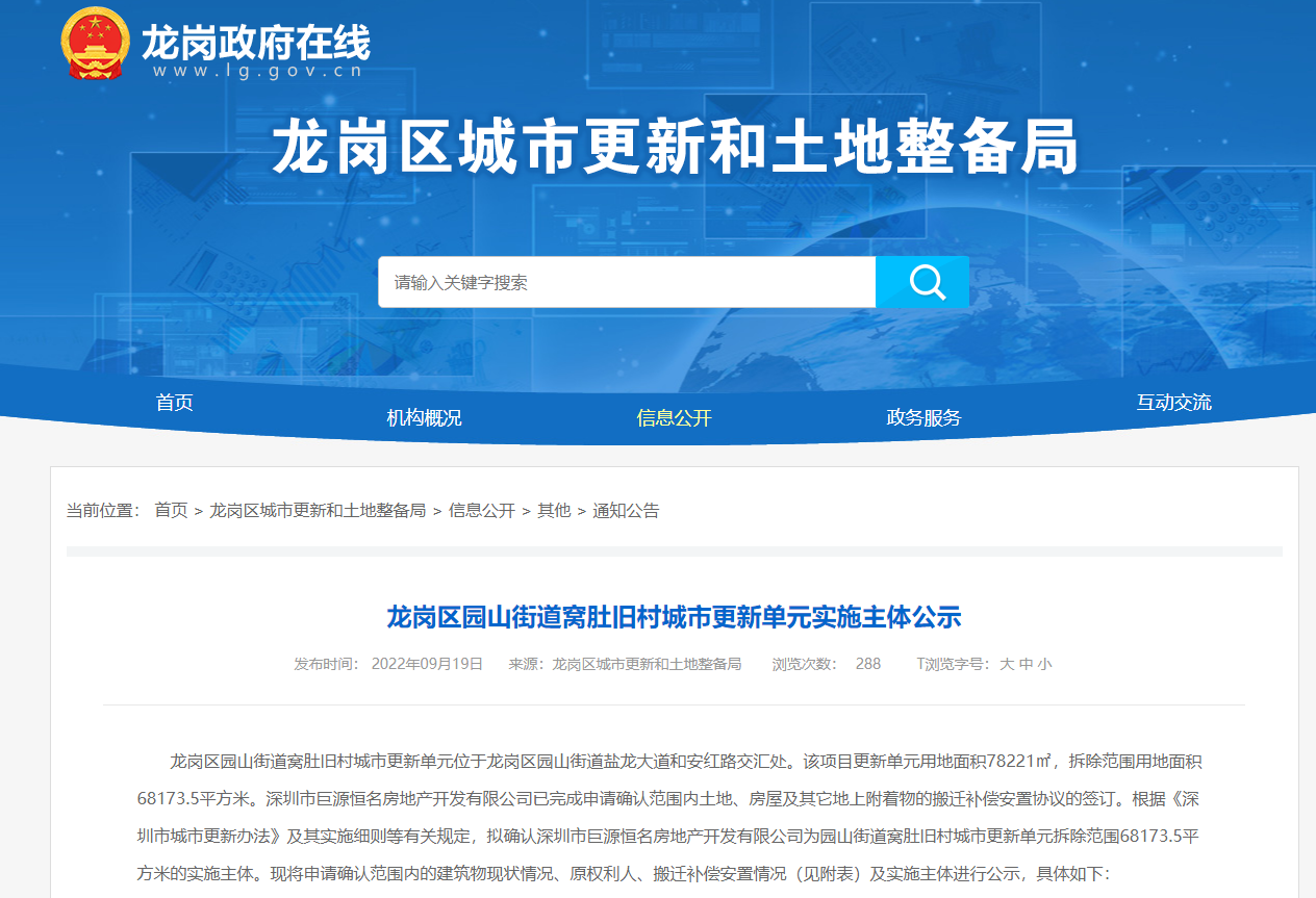 9月13日,深圳市龙岗区城市更新和土地整备局发布《龙岗区园山街道窝肚旧村城市更新单元实施主体公示》的公告,确认深圳市巨源恒名房地产开发有限公司为项目实施主体。项目位...