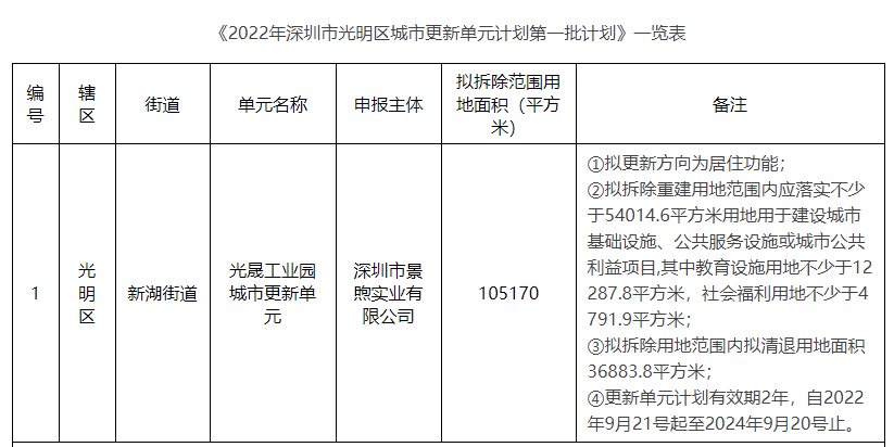 9月21日,2022年深圳市光明区城市更新单元计划第一批计划公告,仅包括新湖街道光晟工业园城市更新单元。新湖街道光晟工业园城市更新单元拟拆除范围用地面积105170平方米,拟...