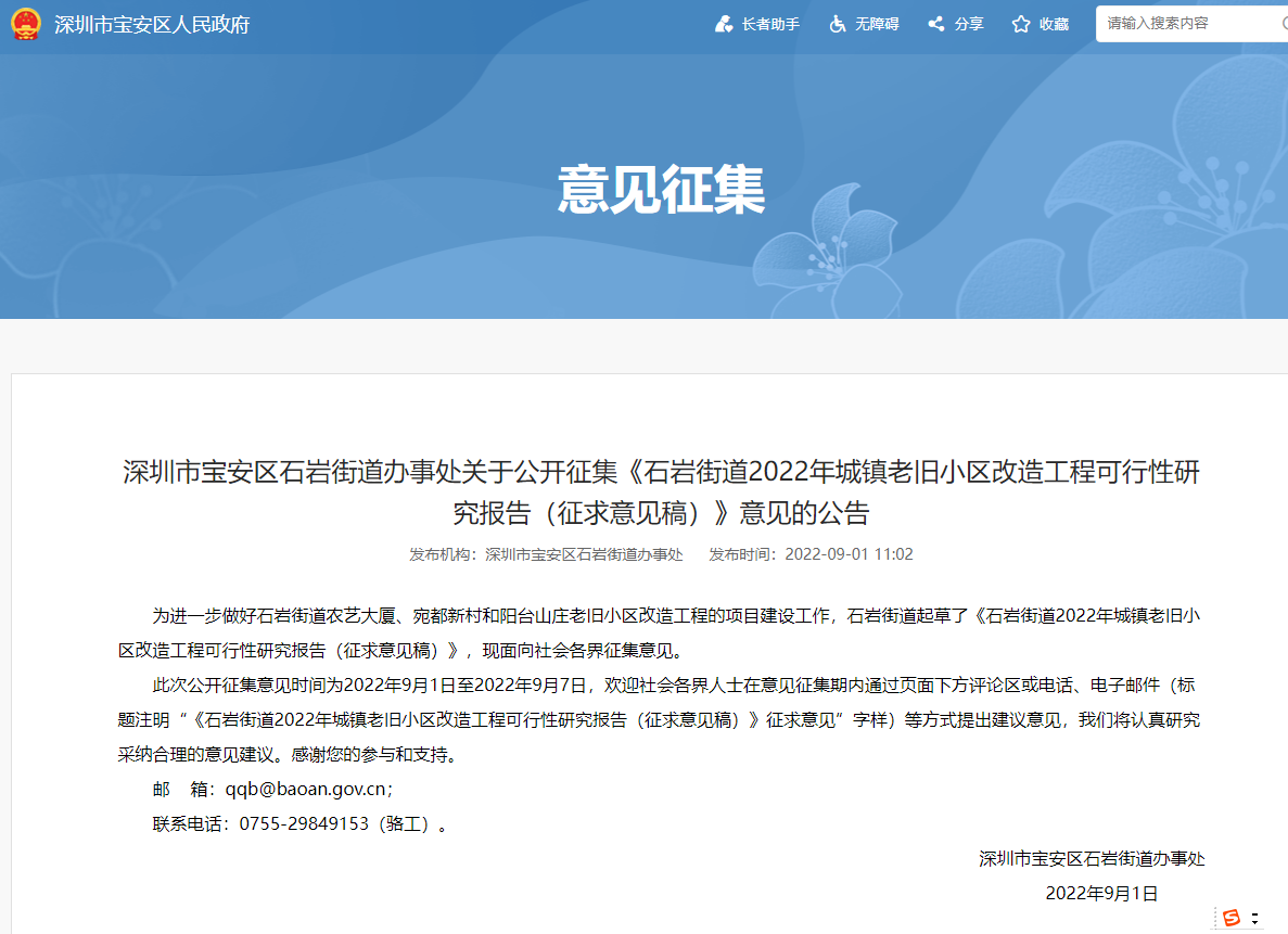 石岩街道发布2022年城镇老旧小区改造工程可行性研究报告(征求意见稿)