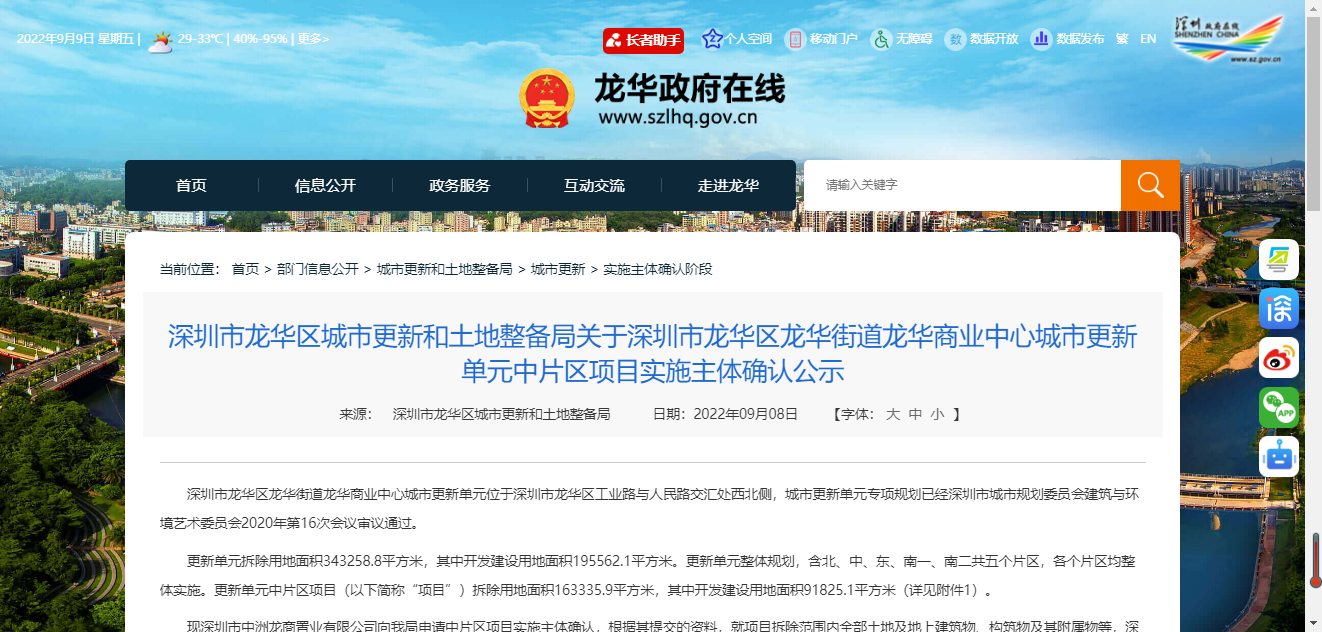 龙华商业中心城市更新单元中片区项目实施主体确认