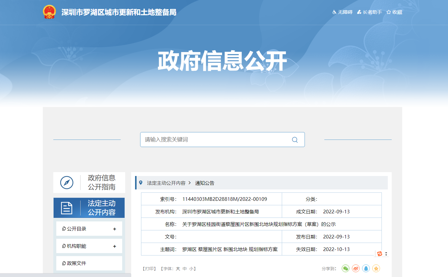 9月13日,深圳市罗湖区城市更新和土地整备局发布《关于罗湖区桂园街道蔡屋围片区新围北地块规划指标方案(草案)的公示》的公告新围北地块位于桂园街道,北临书城路,西临书...