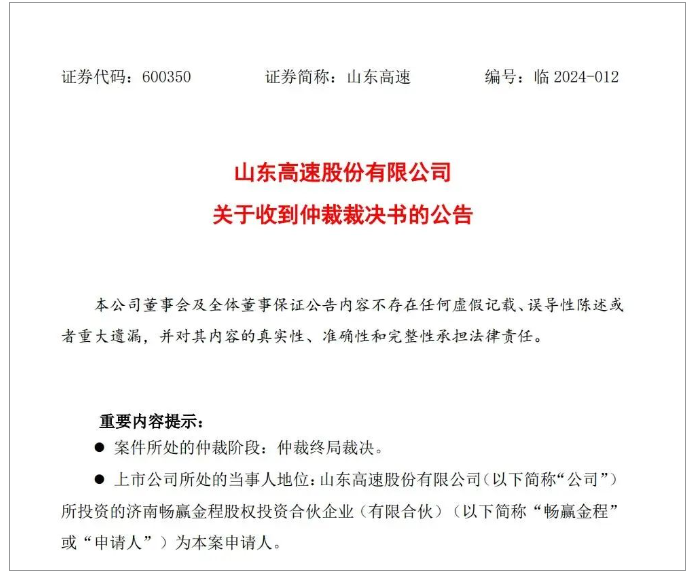 3月17日晚间,山东高速公告称,公司所投资的济南畅赢金程股权投资合伙企业(有限合伙)(简称“畅赢金程”)作为申请人向中国国际经济贸易仲裁委员会(以下简称“贸仲”)提...