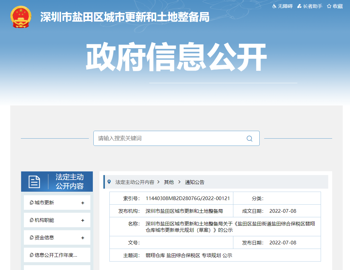 盐田综合保税区翡翔仓库城市更新单元规划(草案)公示