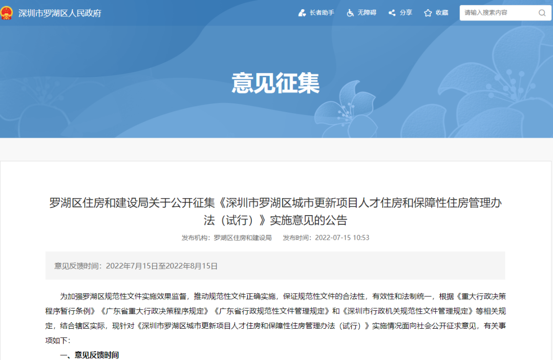 罗湖区城市更新项目人才住房和保障性住房管理办法(试行)公开征求意见