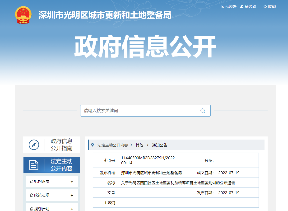 光明区西田社区土地整备利益统筹项目土地整备规划的公布