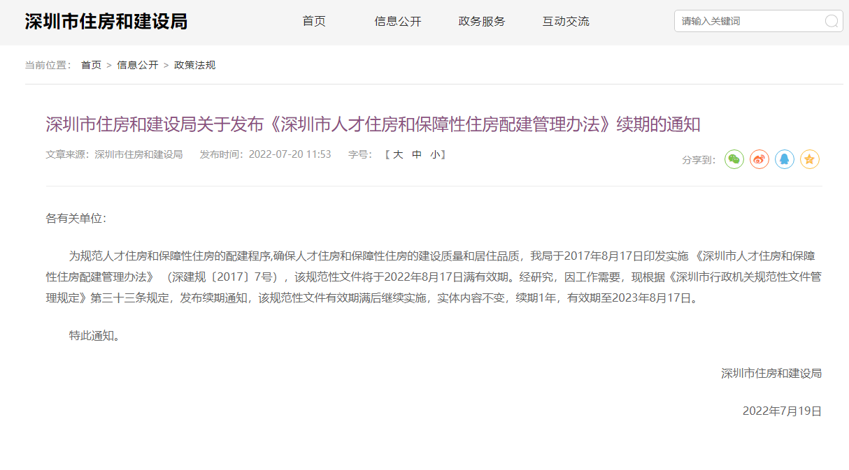 7月20日,深圳市住房和建设局发布《深圳市人才住房和保障性住房配建管理办法》续期的通知。该规范性文件有效期满后继续实施,实体内容不变,续期1年,有效期至2023年8月17日...