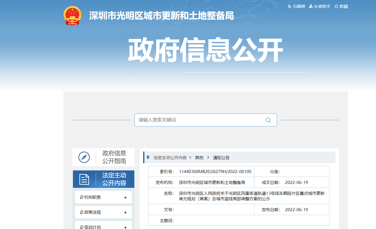 光明区凤凰街道轨道13号线车辆段片区重点城市更新单元已列入《2021年深圳市光明区城市更新单元计划第五批计划》。现该重点城市更新单元规划(草案)及城市蓝线局部调整方案...