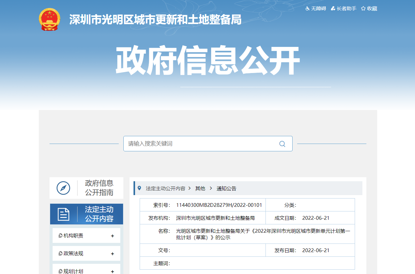 2022年深圳市光明区城市更新单元计划第一批计划(草案)公示