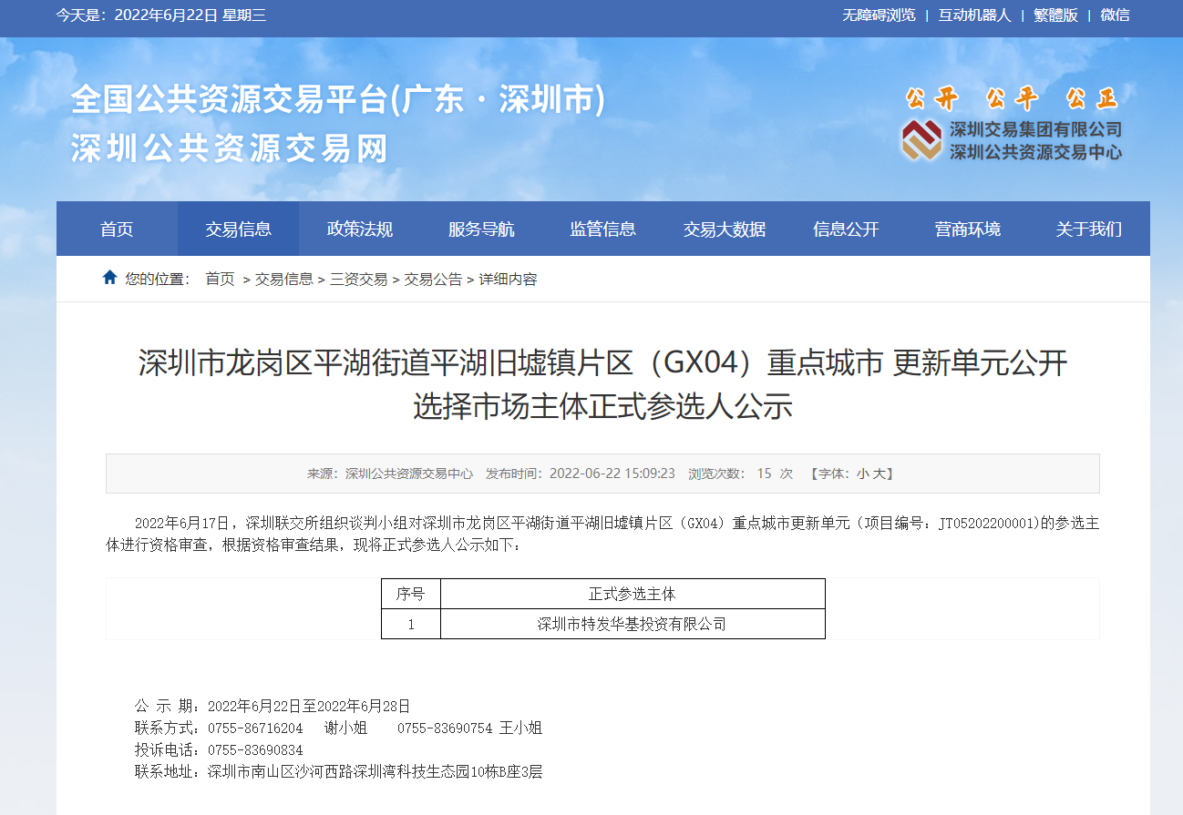 6月22日,深圳公共资源交易中心发布“关于《深圳市龙岗区平湖街道平湖旧墟镇片区(GX04)重点城市更新单元公开选择市场主体正式参选人公示》公告”,深圳市特发华基投资有...
