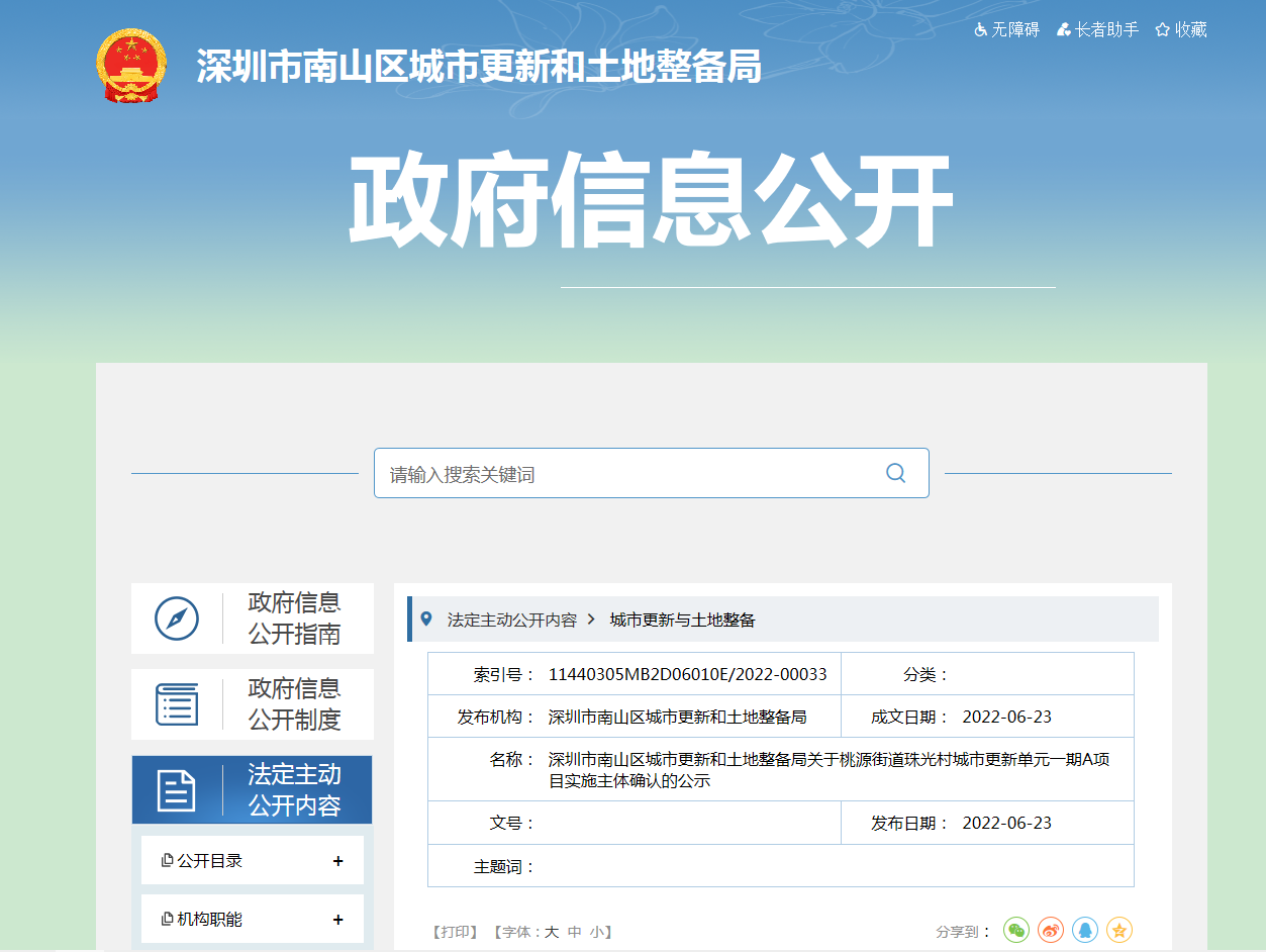 南山珠光村城市更新单元一期A项目实施主体确认,花伴里操刀