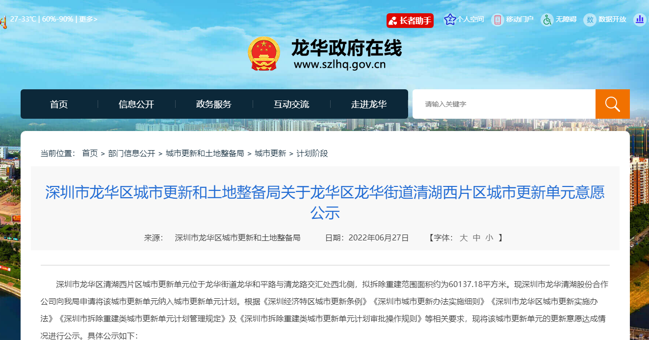 6月28日,深圳市龙华区城市更新和土地整备局发布“龙华区龙华街道清湖西片区城市更新单元意愿公示”公告。深圳市龙华区清湖西片区城市更新单元位于龙华街道龙华和平路与清龙...