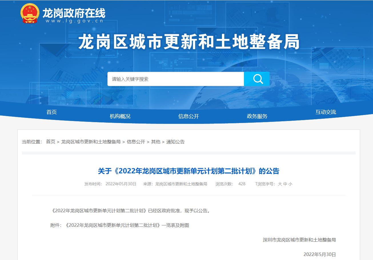 一、5月30日,龙岗区城市更新和土地整备局发布《2022年龙岗区城市更新单元计划第二批计划》的公告,本次公告仅公示一个项目,即坪地街道惠华片区城市更新单元,拟拆除范围用...