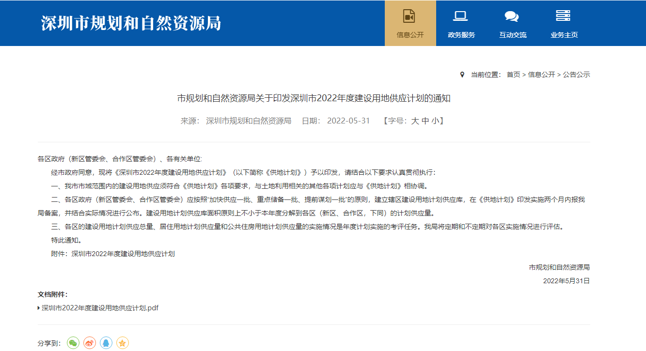 《深圳市2021年度建设用地供应计划》于5月31日公布实施。2022年度全市(含深汕)计划供应建设用地1200 公顷,其中新供应建设用地 986 公顷,更新整备供应建设用地214公顷(...