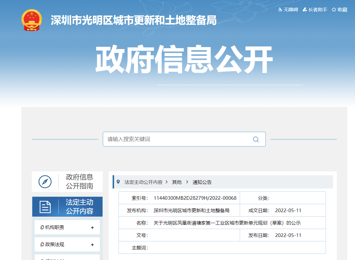 光光明区凤凰街道塘家第一工业区城市更新单元已列入《2019年深圳市光明区城市更新单元计划第一批计划》,2021年完成更新单元计划调整,更新方向调整为居住(采取城市更新方...
