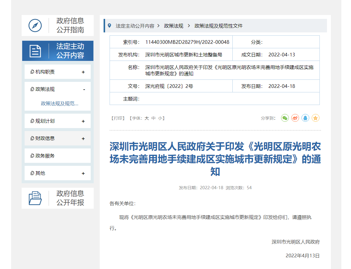 光明区发布原光明农场未完善用地手续建成区实施城市更新规定的通知及政策解读