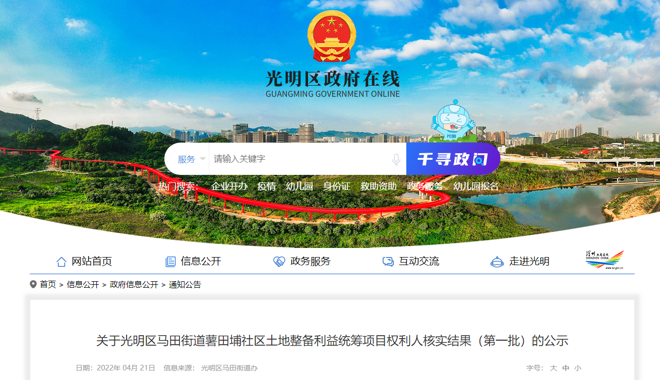 光明区发布薯田埔社区土地整备利益统筹项目权利人核实结果