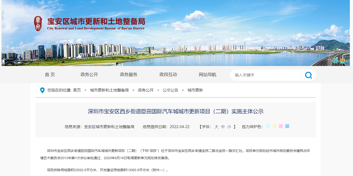 宝安臣田国际汽车城城市更新项目二期实施主体确认,由臣田股份主导