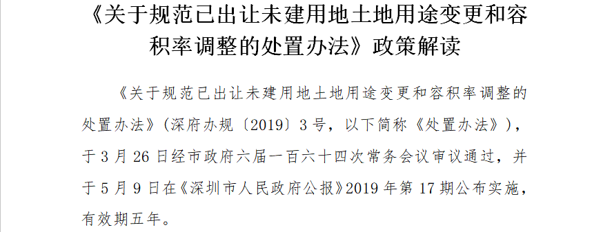 深圳市人民政府办公厅印发关于规范已出让未建用地土地用途变更和容积率调整处置办法的通知