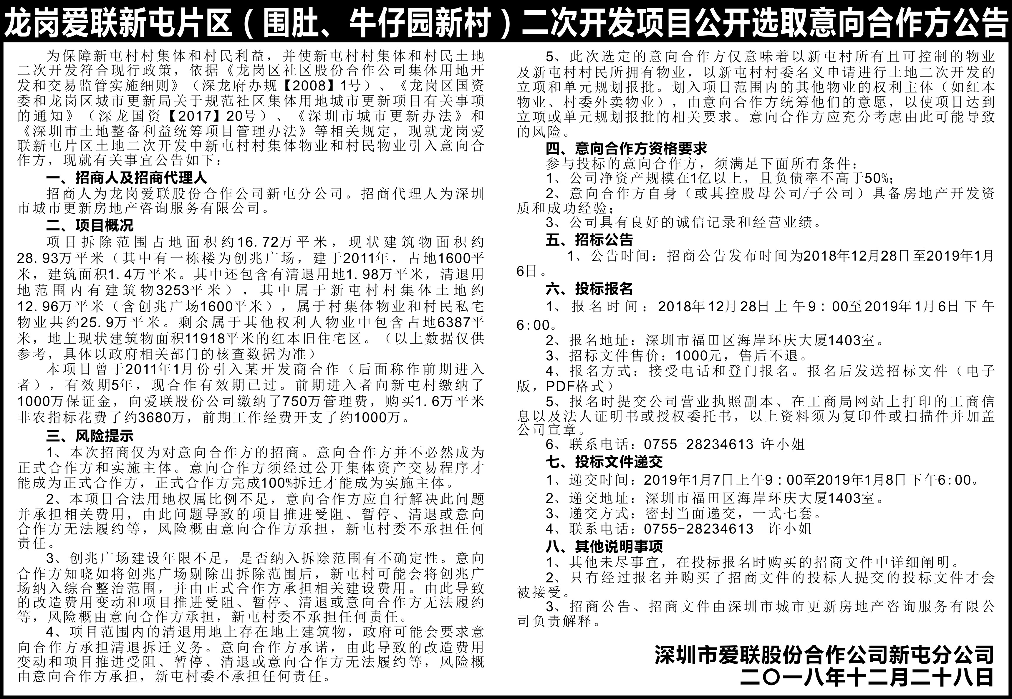 龙岗爱联新屯片区(围肚、牛仔园新村)二次开发项目公开选取意向合作方公告