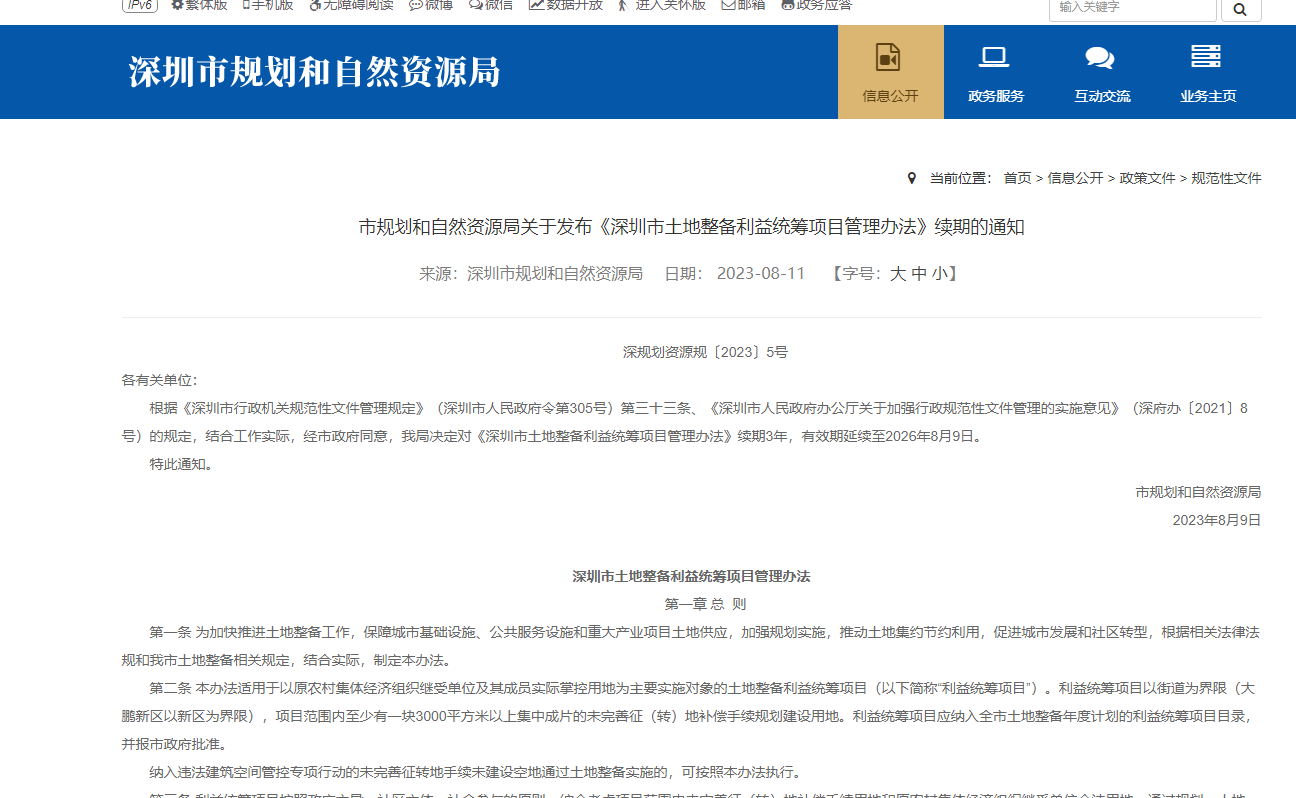 市规划和自然资源局关于发布《深圳市土地整备利益统筹项目管理办法》续期的通知