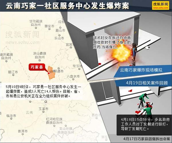 2012年5月9日上午9时许,昭通市巧家县白鹤滩镇花桥社区便民服务大厅发生一起爆炸案。一李姓妇女,因为不满政府征地拆迁,怀抱1岁多的小孩,带上炸药包进入服务大厅的协议签订现场后,点燃了导火索实施自杀式爆炸。截至昨晚21时许,政府最新通报称,该事件造成4人死亡16人受伤。事故发生后,伤者被送到巧家县人民医院接受治疗,其中4名重伤者已转入昆医附一院进行抢救,在治疗过程中有一名伤者胡某死亡 ,初步确定身份为当地国土局的干部。