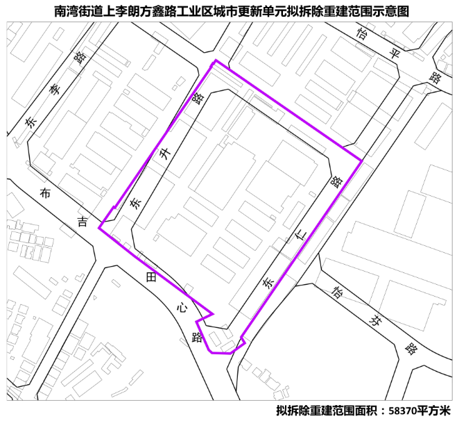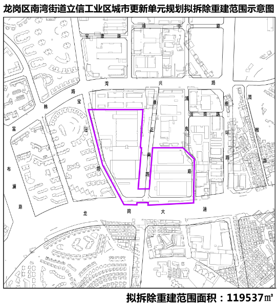 南湾街道 | 上李朗方鑫路工业区城市更新单元 | 深圳市龙成房地产开发有限公司 | 58370 | ① 拟更新方向为新型产业功能。 ② 拟拆除重建用地范围内应落实不少于17861平方米规划道路用地等公共利益用地。 |