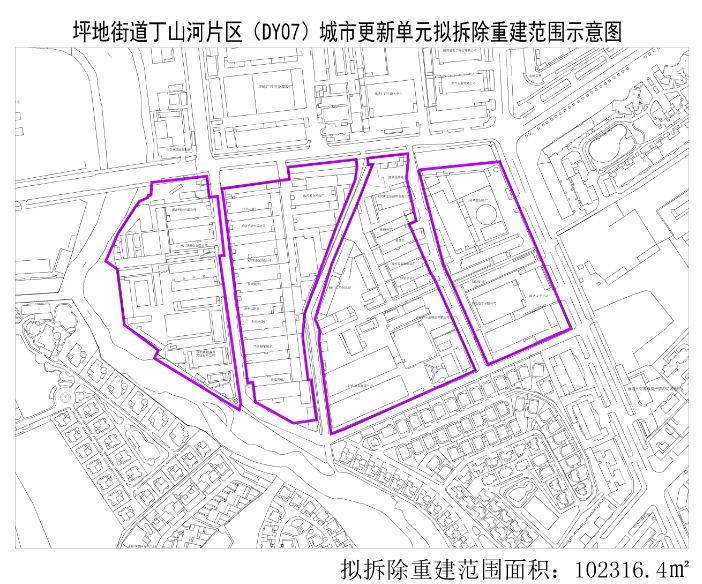 坪地街道 | 丁山河片区(DY07)城市更新单元 | 深圳市碧桂衡佳投资有限公司 | 102316.4 | ① 拟更新方向为居住、商业功能。 ② 拟拆除重建用地范围内应落实不少于51845平方米的公共利益用地。 |