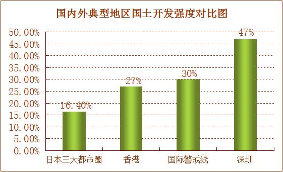 从名单中可以看出,这些开发商基本上都是和大盘开发模式联结在一起的。通过在城乡结合部拿取动辄上千亩的土地,通过大盘和超级大盘的开发,从而实现了跳跃式发展。中国的大盘开发模式起于20世纪末广州的华南版块,经历了21世纪前十几年的高速发展,终于造就了万科、恒大、碧桂园等众多的房企大佬。但城郊大盘摊大饼式的开发模式带来的问题陆续开始显现,比如土地资源的紧张、环境恶化、囤地、拆迁所带来的社会问题等。特别是大盘开发模式对土地资源的极大浪费,已经使城市化率高的地区陷入了土地资源枯竭的地步。下图是世界几个典型地区的国土开发强度对比图: