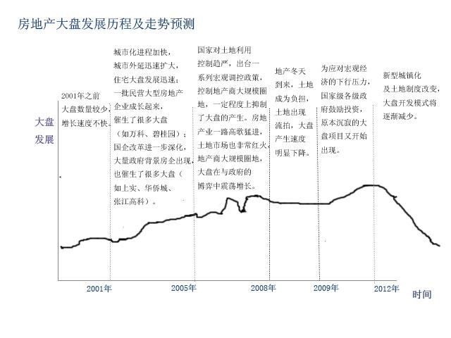 从图中可以看出,相比日本三大都市圈,深圳已经把可以开发的地方开发完毕,未来大盘开发现象将逐渐减少。大盘开发历程和走势预测如下图: