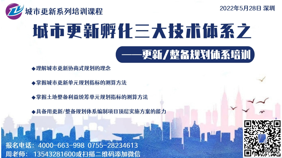 优惠说明:5人及5人以上集体报名9折优惠,10人及10人以上集体报名8折优惠,5月22日之前报名并缴费者,另外再享受9折优惠,并赠送《城市更新三大技术体系之政策法规体系》视频课程。