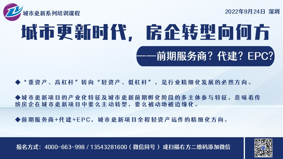 本次培训,城市更新网将为您探讨:城市更新时代下,如何在城市更新项目的前期、中期、后期,通过前期服务商+代建+EPC,实现项目全程由重向轻的转型。