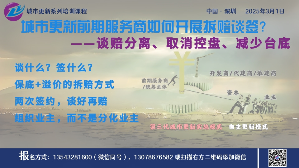 城市更新网按城市更新前期服务商/统筹主体语境下拆赔谈签的目标导向和价值主张,对过去十几年传统开发商拆迁谈判的流程进行重塑,基础技能加以改造,结合城市更新网目前开展城市更新自主更新中的实践经验,形成了本次的课程。