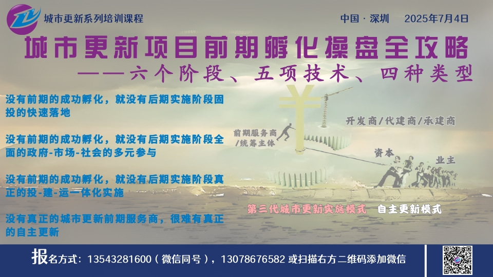围绕着城市更新前期服务商/统筹主体的更新孵化操盘逻辑,城市更新网在过去多年孵化服务实践的基础上,研发并开展了城市更新前期服务商如何算账、如何开展拆赔谈签、如何开展报批报审、如何市场拓展与项目进入四门核心课程。如果说这四门是为城市更新项目孵化准备的四颗珍珠,那本次这第五门课程——城市更新项目孵化操盘全攻略,就是串起这四颗珍珠的金线。由此,城市更新网为城市更新前期服务商打造的战袍初步成型。
