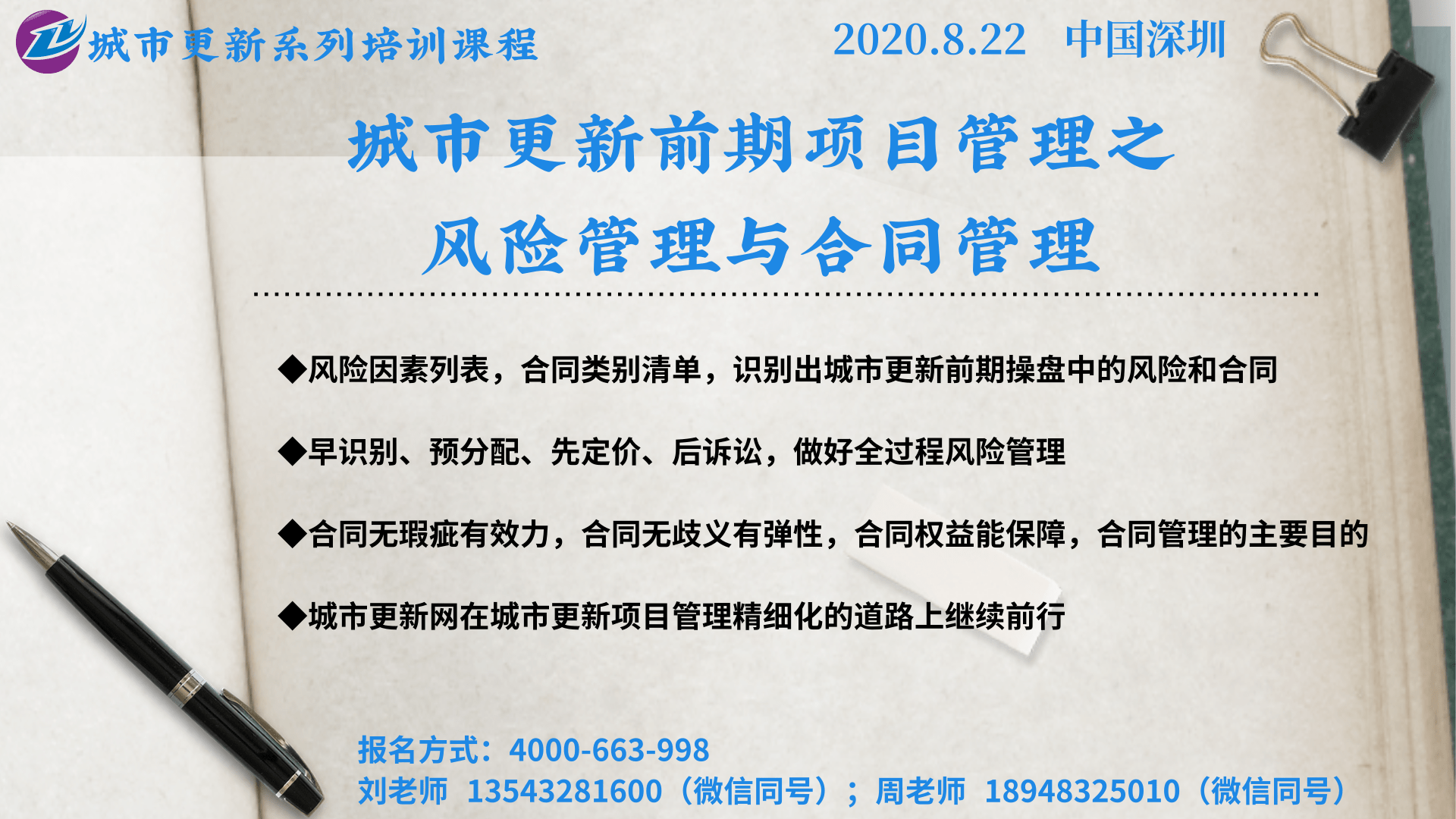 城市更新网在城市更新项目精细化管理的道路上继续前行。继7月推出城市更新项目管理之费用管理后,本次,联合业界在城市更新合同管理和合同诉讼方面最有经验的大律师,推出8月份的城市更新项目管理之合同管理和风险管理,以飨业界。