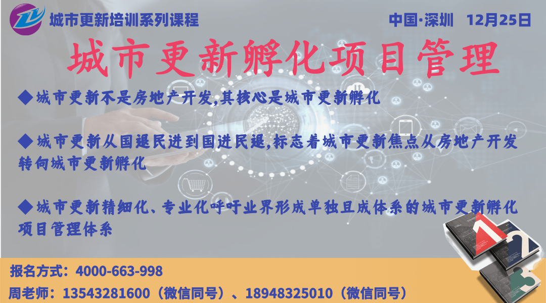 城市更新孵化运作在深圳经过十余年的发展,在信息核查、规划设计、拆赔谈判等具体技术环节上日趋成熟。但在城市更新孵化日益精细化、专业化的今天,在城市更新孵化阶段日益成为独立运作体系的今天,由后期房地产开发项目总,在早期由房地产开发主导下的城市更新时代,直接转型为城市更新项目总的城市更新人才形成之路,越来越不适应城市更新孵化的要求。城市更新孵化需要专门适应城市更新项目从项目发起,到项目过程控制,到项目交付或流转的专门城市更新孵化项目管理人才。城市更新网在数十年研究及实践的基础上,打造出本次城市更新业界首次全面的城市更新孵化项目管理课程,诚邀致力于城市更新的企业和人才参与......。